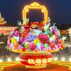 9月25日,2025年“祝福祖国”巨型花篮正式完工,亮相天安门广场与市民共度佳节。今年“祝福祖国”花坛以喜庆的花篮为主景,花坛顶高18米,篮体高16米,篮盘直径12米。篮体南侧书写“祝福祖国”“1949-2025”字样,篮体北侧书写“欢度国庆”“1949-2025”字样。篮内选取了美好寓意的花卉,其中荷花寓意“和和美美”、橄榄枝寓意“荣耀和平”等,还结合和平鸽元素,体现“和平发展、欣欣向荣”。