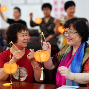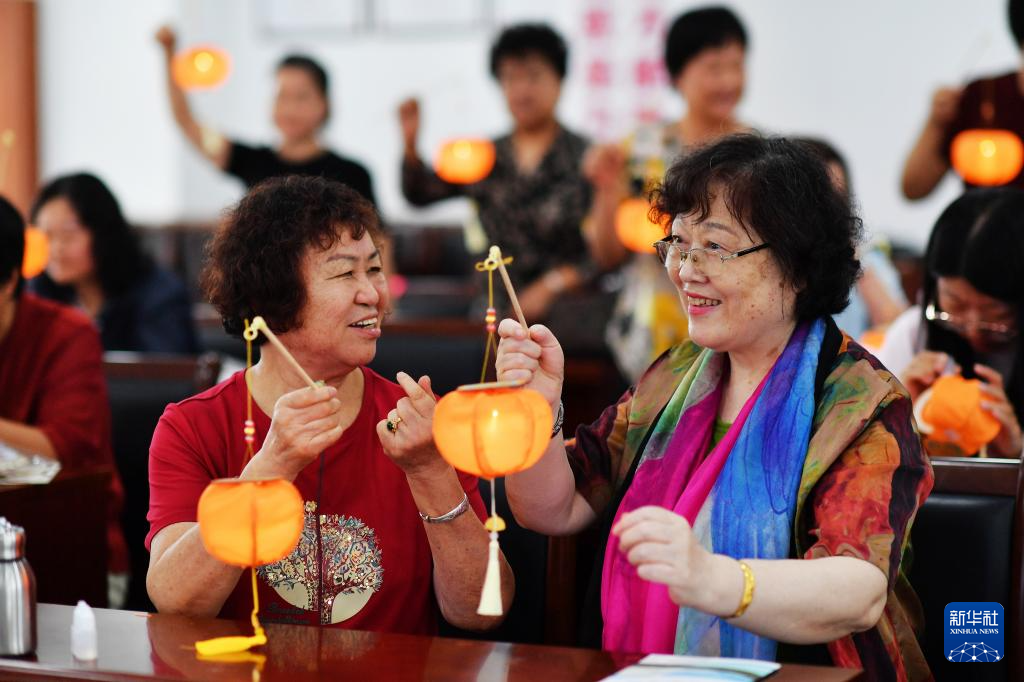 9月26日,在山东省青岛市崂山区金家岭街道钟家沟社区开展的迎“双节”主题活动上,居民展示“柿柿如意”花灯。