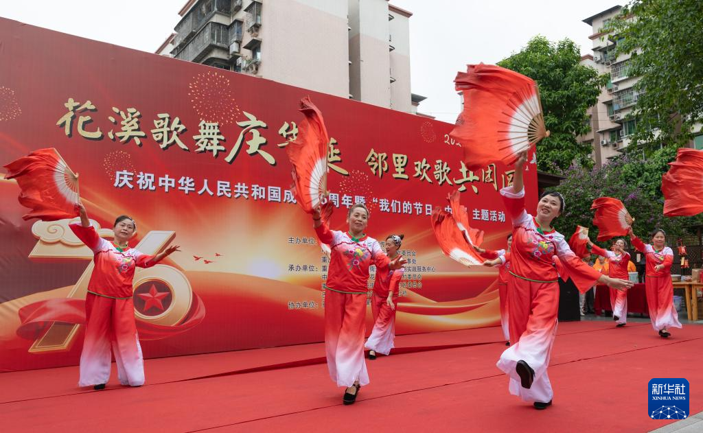 9月26日,在重庆巴南区花溪街道先锋新村小区,社区舞蹈演员表演舞蹈《五星红旗》。