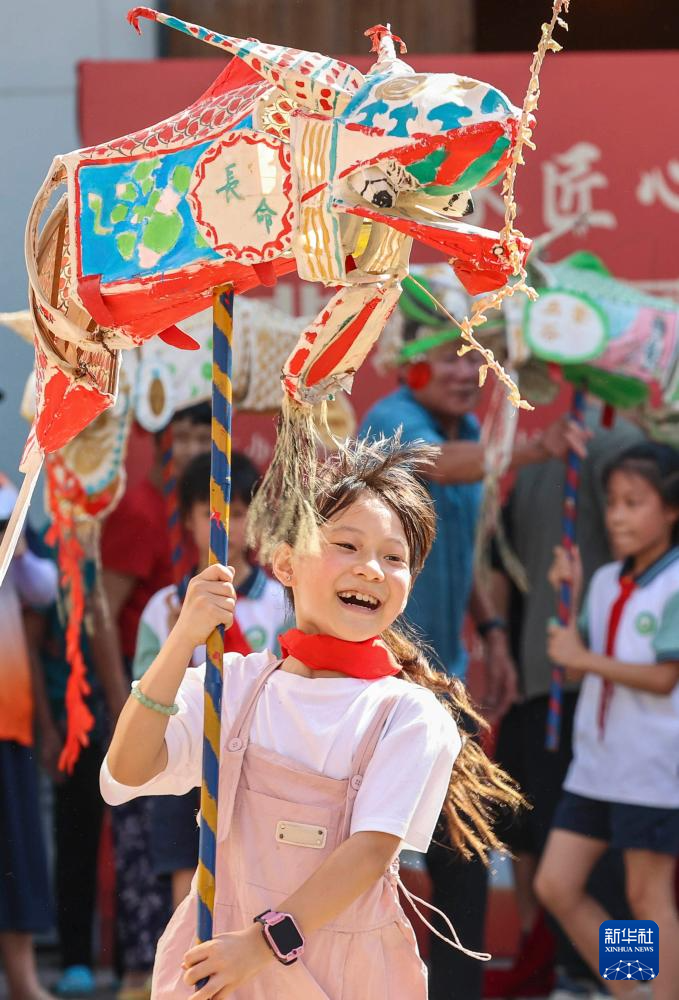 9月26日,在浙江省湖州市德清县武康街道对河口村,小朋友参加非遗迎国庆主题活动。