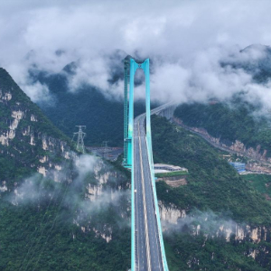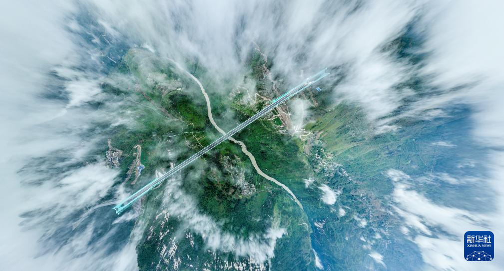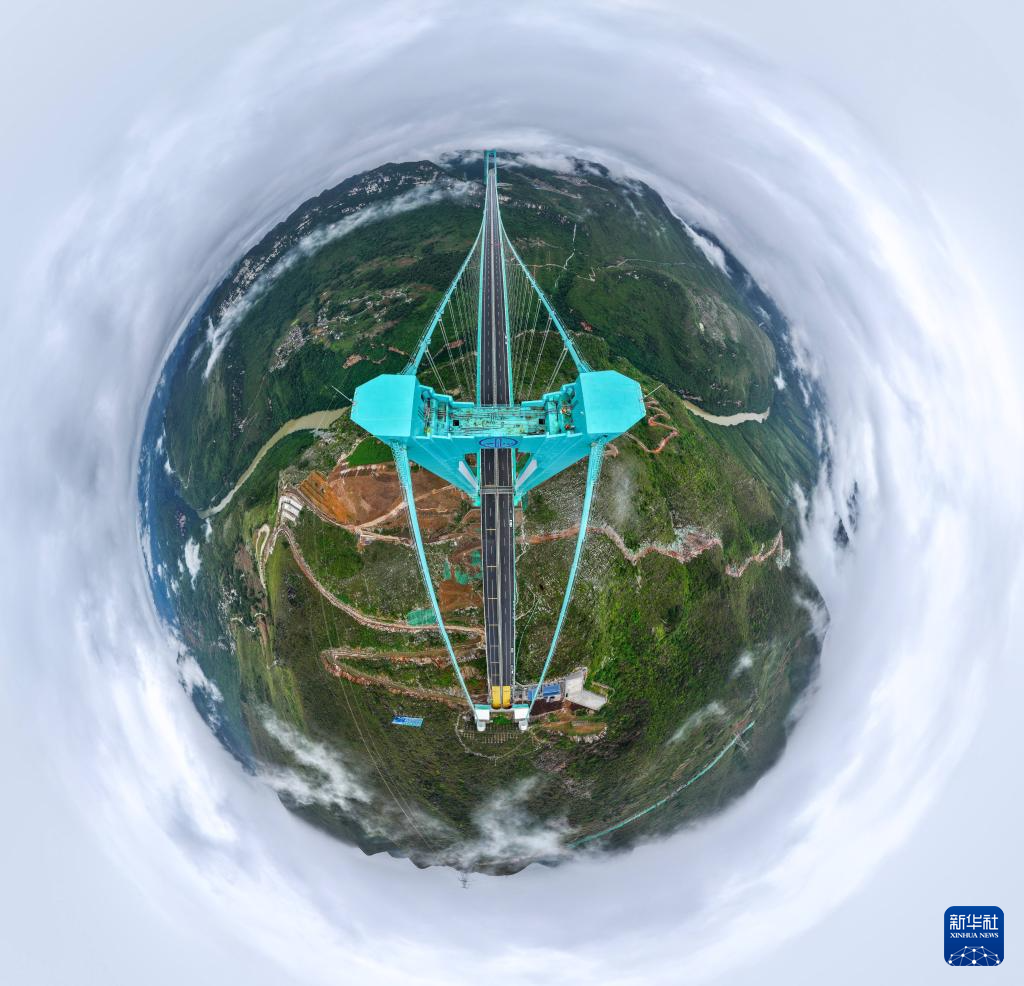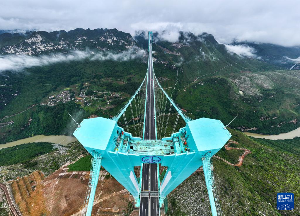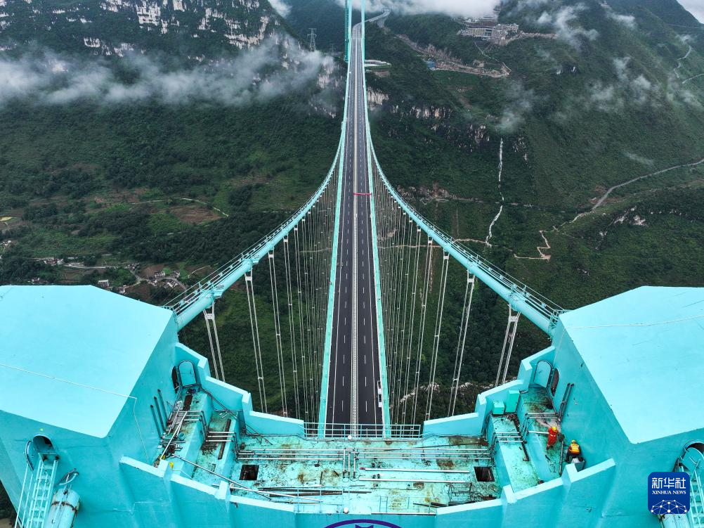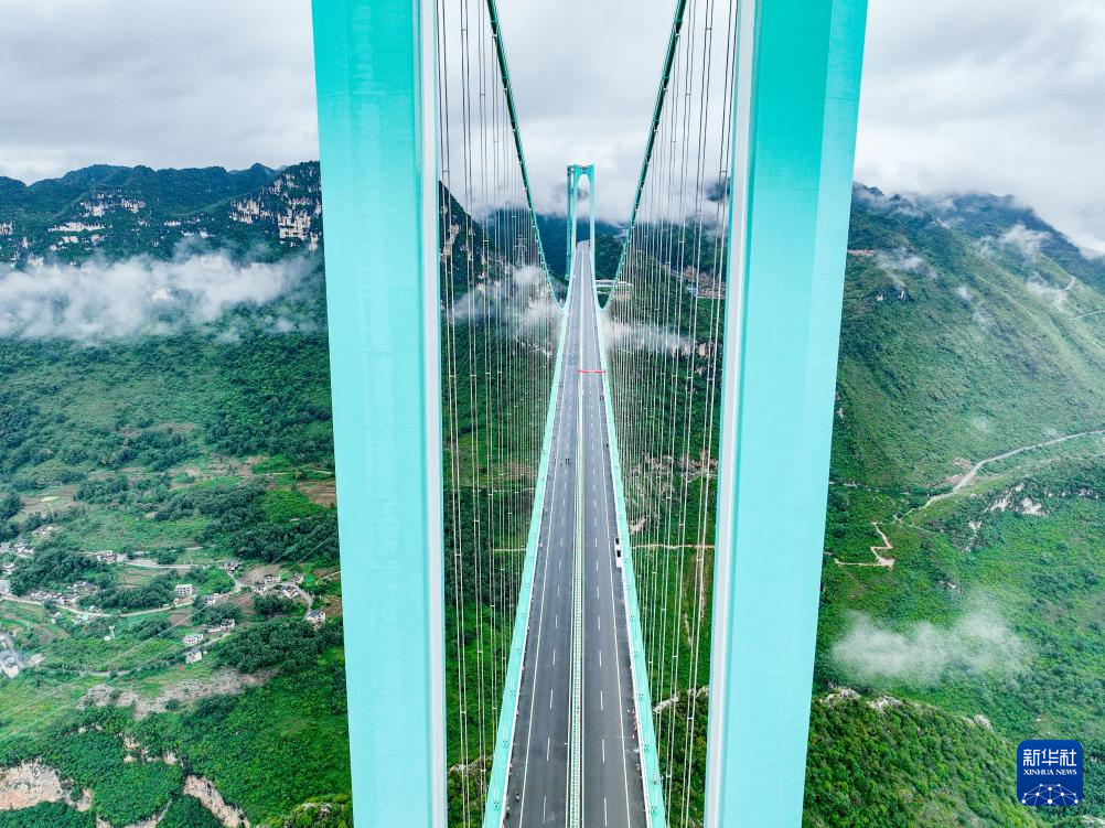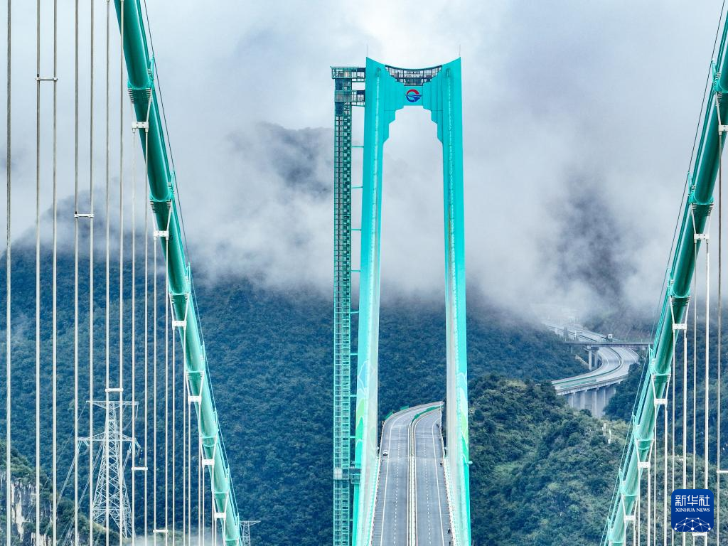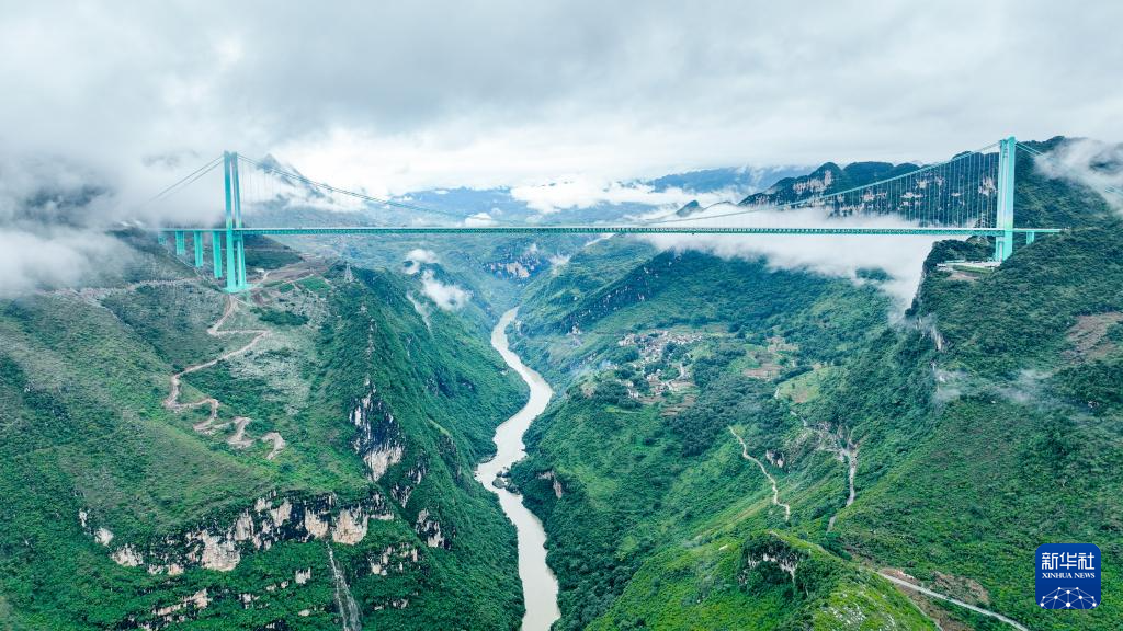 9月26日,雨后的贵州花江大峡谷云雾笼罩,花江峡谷大桥如同“钢铁巨龙”腾跃峡谷之上。花江峡谷大桥是贵州六枝至安龙高速公路的控制性工程,大桥全长2890米,主跨径1420米,是目前世界山区峡谷第一大跨度钢桁梁悬索桥;其桥面距水面垂直高度625米,是新的世界第一高桥。经过三年多建设,贵州花江峡谷大桥将于9月28日正式建成通车。