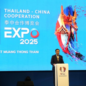 9月26日,在泰国曼谷,泰国总理阿努廷在2025泰中合作博览会开幕式上致辞。