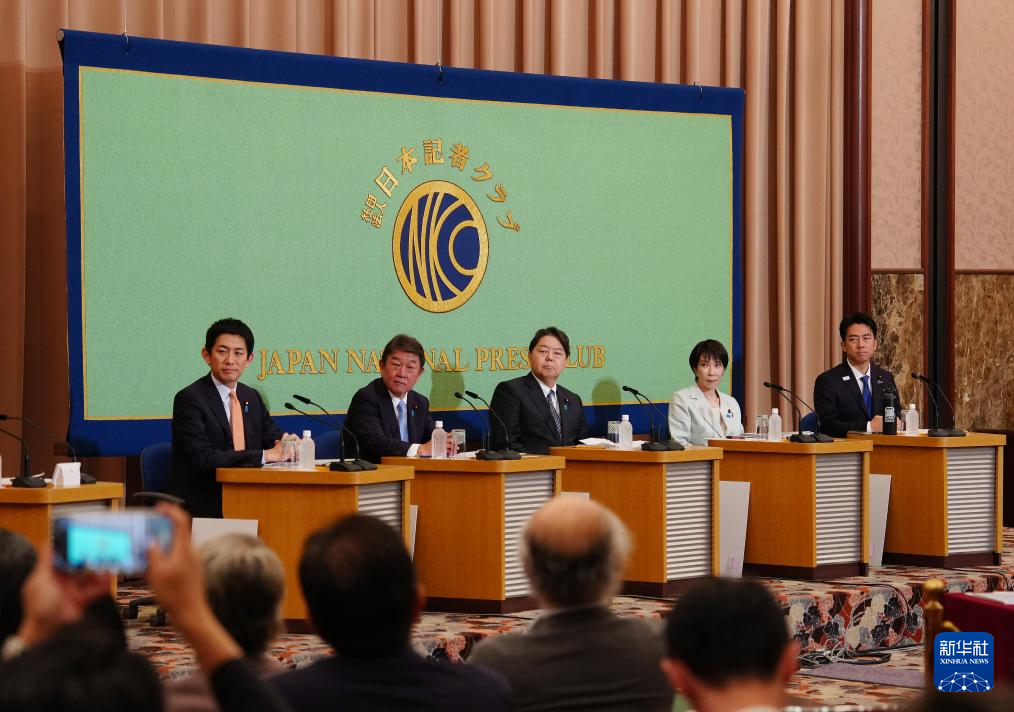 9月24日,在日本东京,日本自民党总裁选举候选人小林鹰之、茂木敏充、林芳正、高市早苗和小泉进次郎(从左至右)出席辩论会。