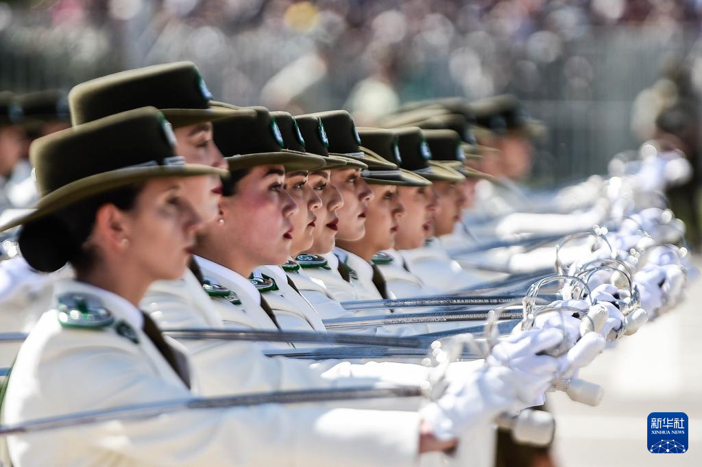 9月19日,在智利首都圣地亚哥奥伊金斯公园内,女宪兵在阅兵式上列队行进。