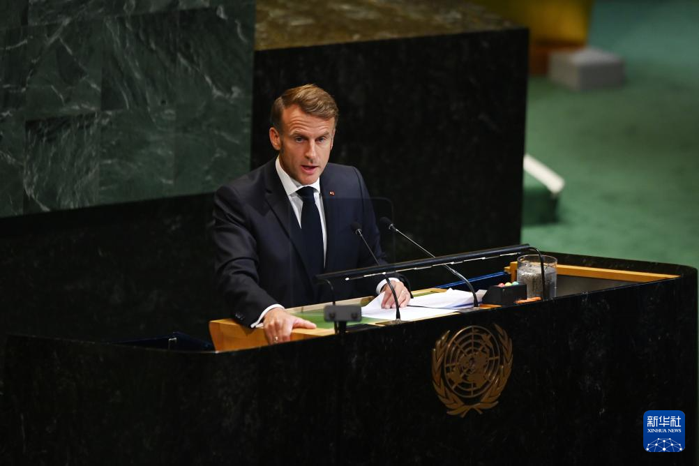 9月22日,在位于纽约的联合国总部,法国总统马克龙在和平解决巴勒斯坦问题和落实“两国方案”高级别国际会议上讲话。