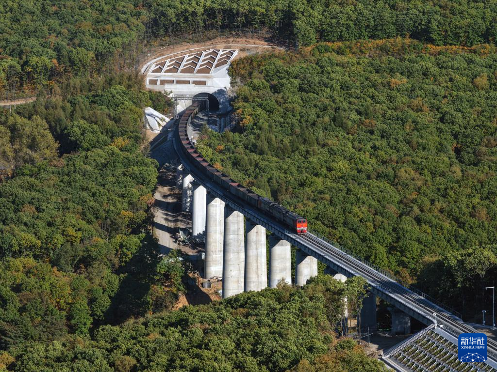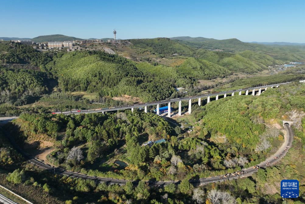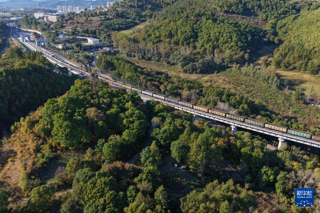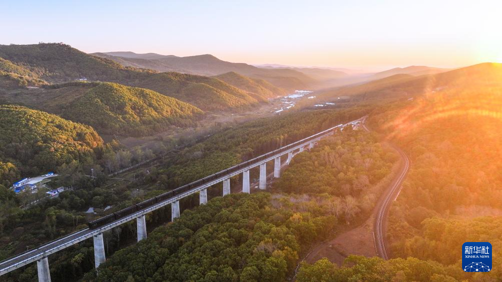 9月27日,一列货车在滨绥铁路绥芬河至国境线提质改造工程新线路上行驶(无人机照片)。