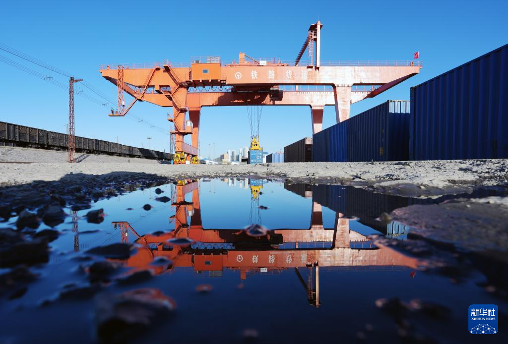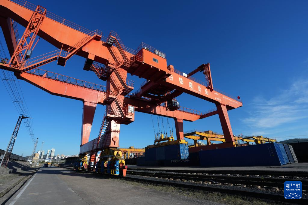 9月27日,在绥芬河站集装箱换装场,龙门吊在对回程中欧班列进行换装作业。