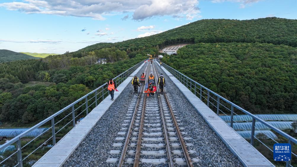 9月26日,工作人员对新线钢轨进行轨距测量作业(无人机照片)。