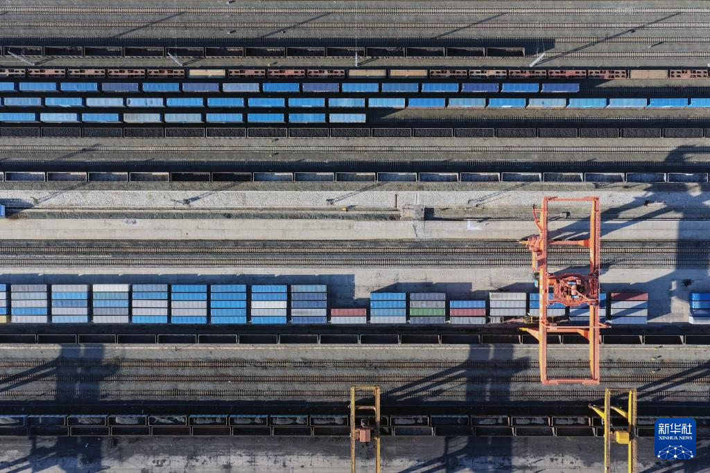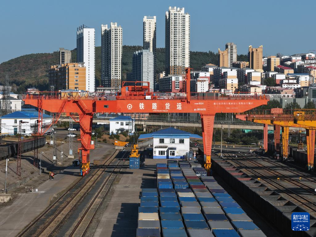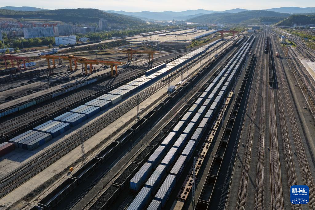 9月27日,满载货物的列车在绥芬河站北场进行换装作业(无人机照片)。