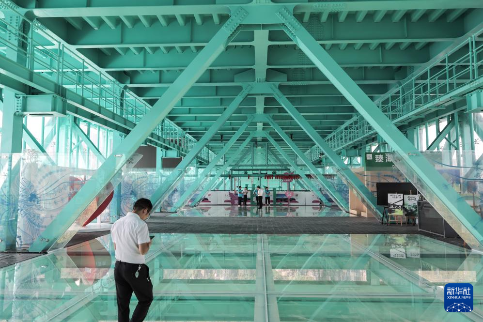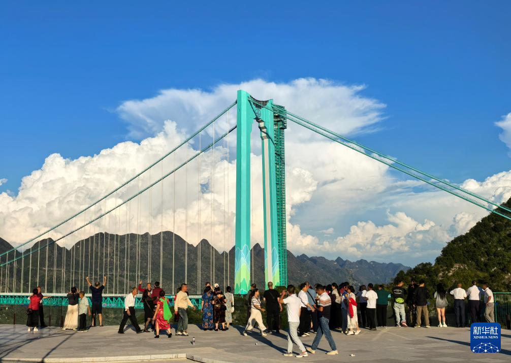 9月28日,参观者在花江峡谷大桥的玻璃观光廊道上行走。