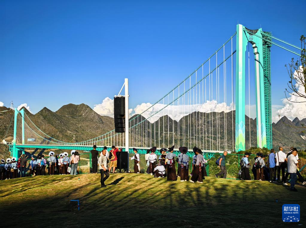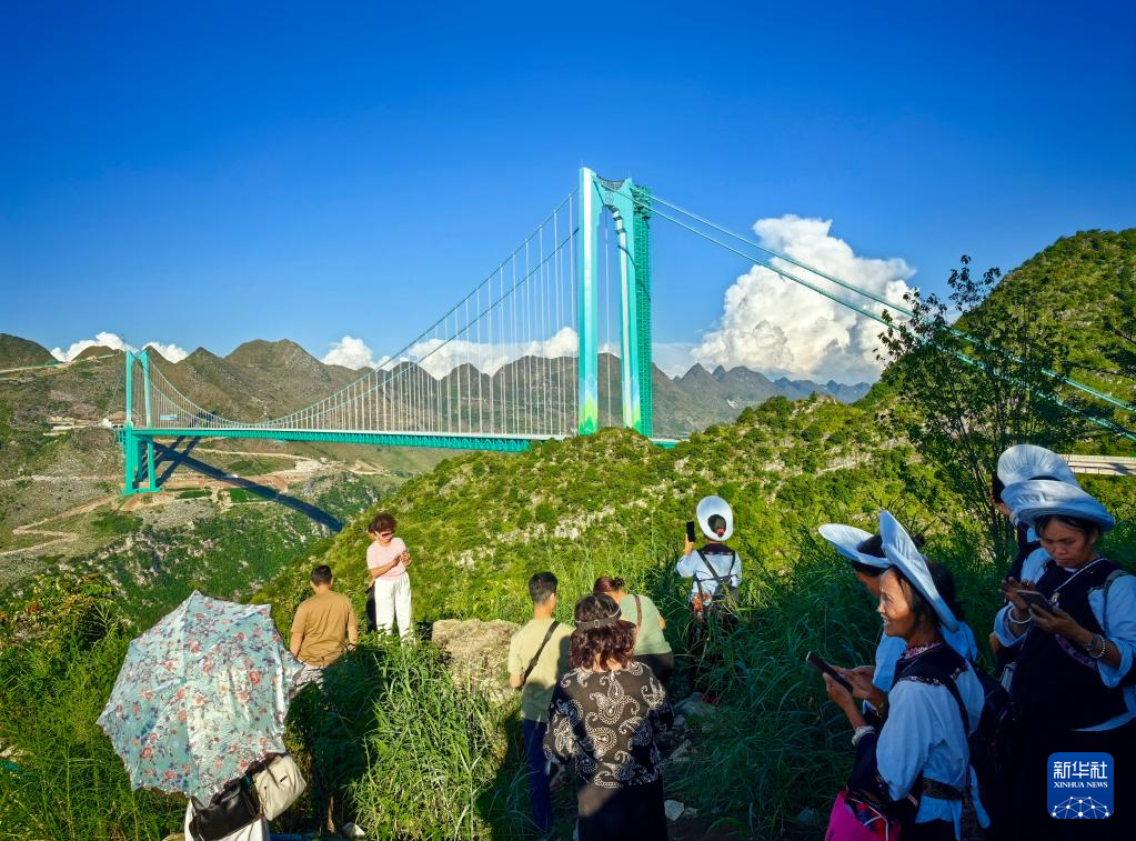 9月28日,游客在贵州花江峡谷大桥旁的云渡服务区参观大桥(手机照片)。