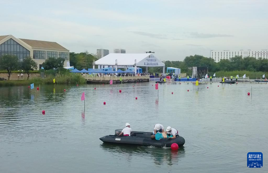 9月28日,在驾驶橡皮艇救生比赛项目中,参赛选手把道具假人转移到岸上。
