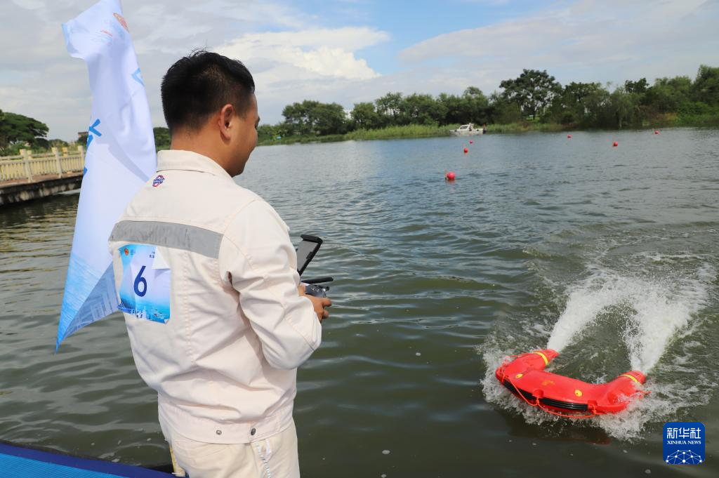 9月28日,在驾驶橡皮艇救生比赛项目中,参赛选手从水中救起道具假人(无人机照片)。