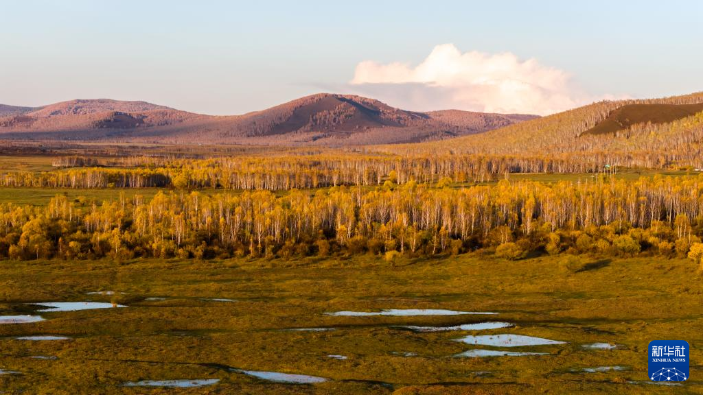 这是9月25日在内蒙古呼伦贝尔市额尔古纳市恩和俄罗斯族民族乡拍摄的白桦林与湿地(无人机照片)。
