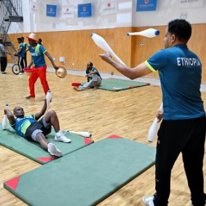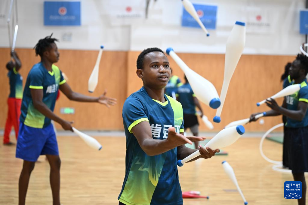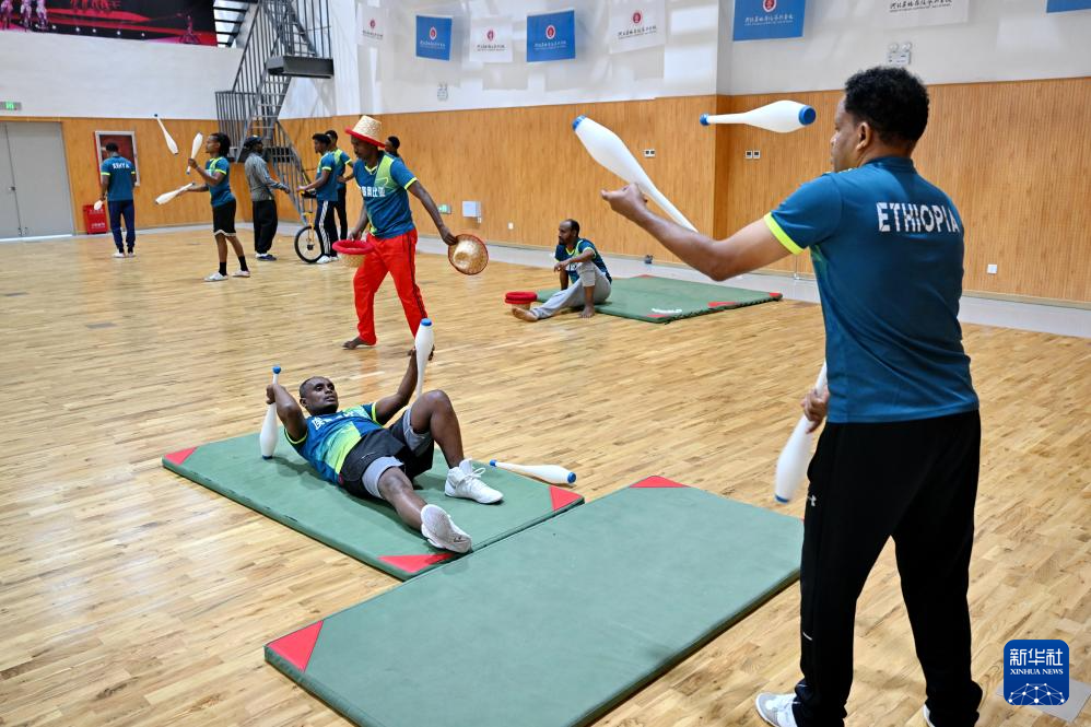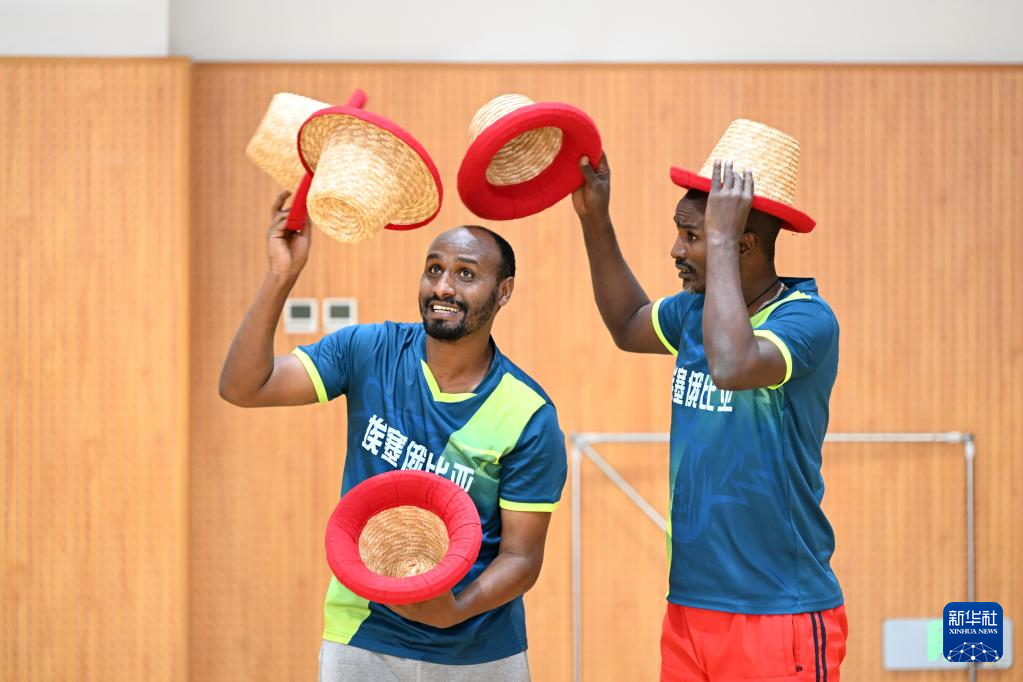 9月28日,两名来自埃塞俄比亚的学员在河北吴桥杂技艺术学校排练厅内练习帽子技巧。