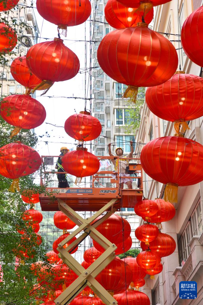 9月28日,工作人员在香港利东街悬挂大红灯笼。