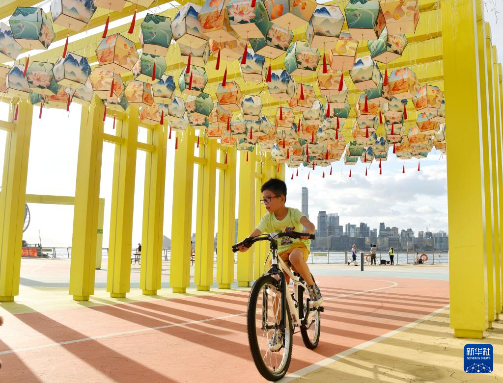 9月27日,在香港东岸公园,一名男孩骑车从中秋彩灯下经过。