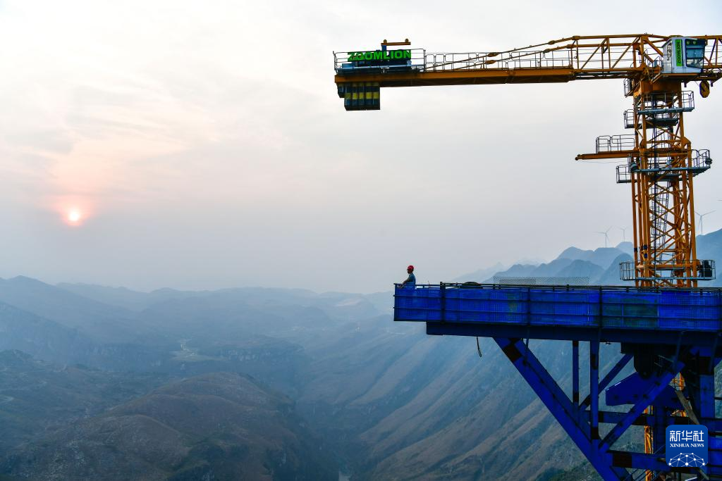 2024年3月26日,工程师在贵州花江峡谷大桥的桥塔上查看桥梁建设进度。