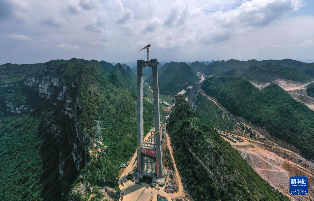 2023年6月14日拍摄的贵州花江峡谷大桥桥塔施工现场(无人机照片)。