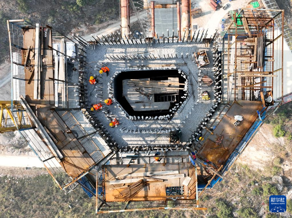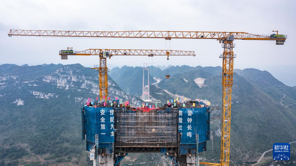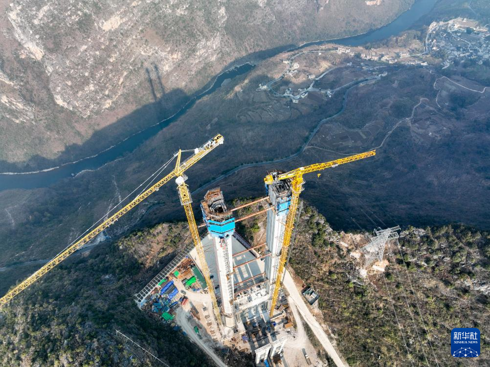 2023年2月1日拍摄的贵州花江峡谷大桥主塔施工现场(无人机照片)。