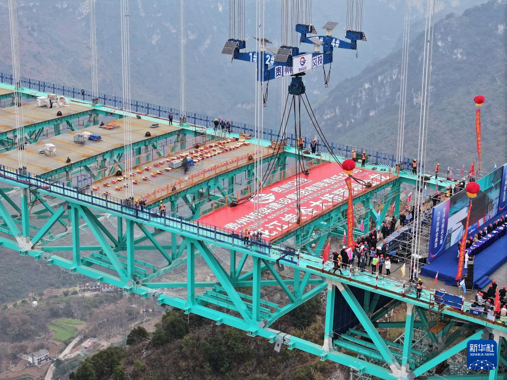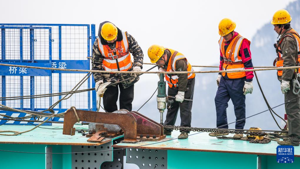 2025年1月14日,工人在为吊装贵州花江峡谷大桥最后一个节段钢桁梁做准备。