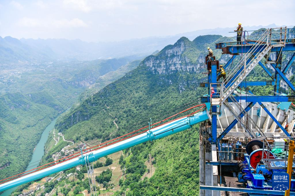 2025年6月6日,工人在贵州花江峡谷大桥桥塔顶上施工。