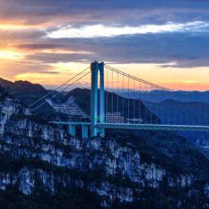 花江峡谷大桥是贵州六枝至安龙高速公路的控制性工程,大桥全长2890米,主跨1420米,是目前世界山区峡谷第一大跨度钢桁梁悬索桥;其桥面距水面垂直高度625米,超越北盘江第一桥成为新的“世界第一高桥”。