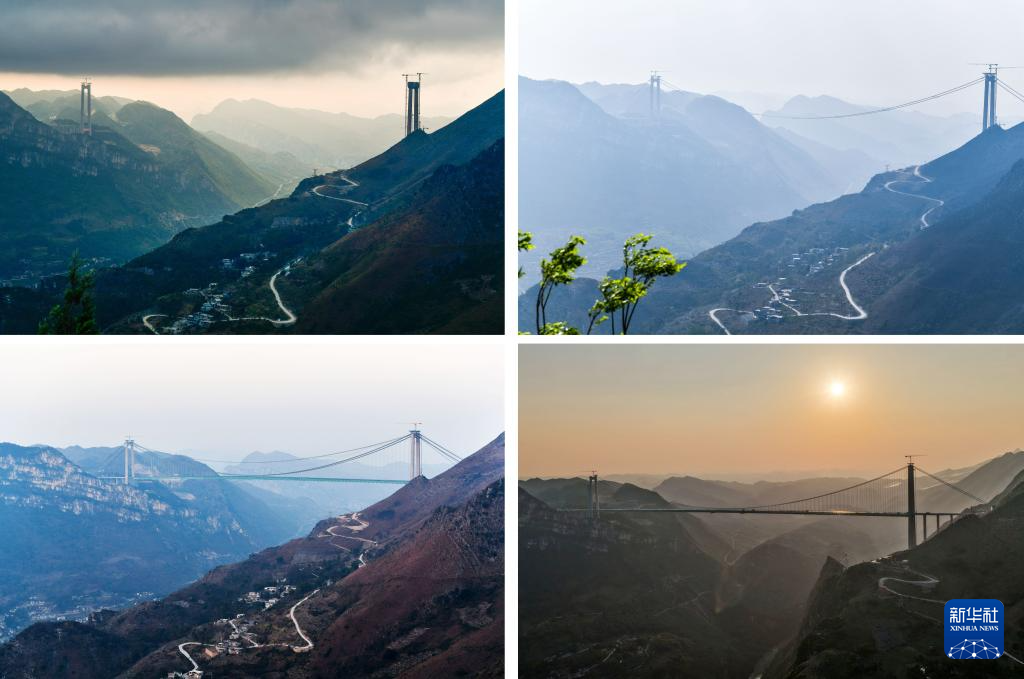 拼版照片:左上图为桥塔建设中的贵州花江峡谷大桥(2023年11月8日摄),右上图为施工猫道搭建中的贵州花江峡谷大桥(2024年3月26日摄),左下图为合龙前的贵州花江峡谷大桥(2025年1月13日摄),右下图为通车前一天的贵州花江峡谷大桥(2025年9月27日摄)。