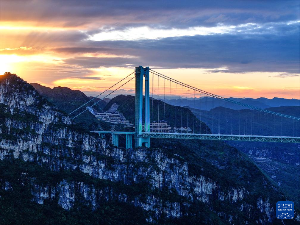 2025年9月27日拍摄的晚霞中的贵州花江峡谷大桥(无人机照片)。