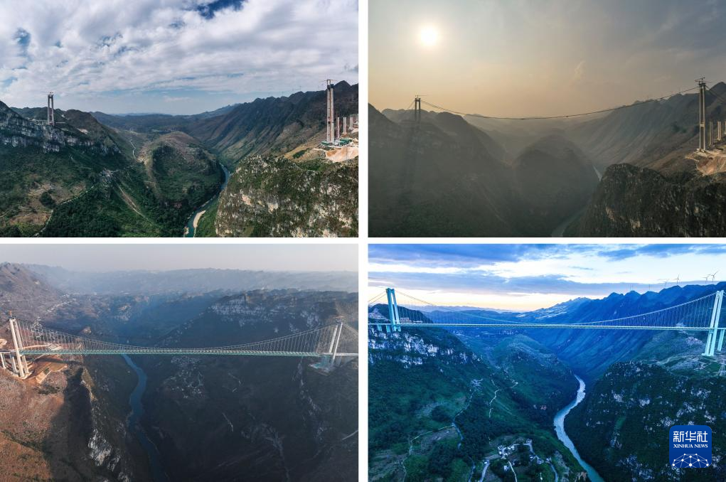 拼版照片:左上图为桥塔建设中的贵州花江峡谷大桥(2023年11月7日摄),右上图为施工猫道搭建中的贵州花江峡谷大桥(2024年3月26日摄),左下图为合龙前的贵州花江峡谷大桥(2025年1月14日摄),右下图为施工猫道拆除中的贵州花江峡谷大桥(2025年6月11日摄)。