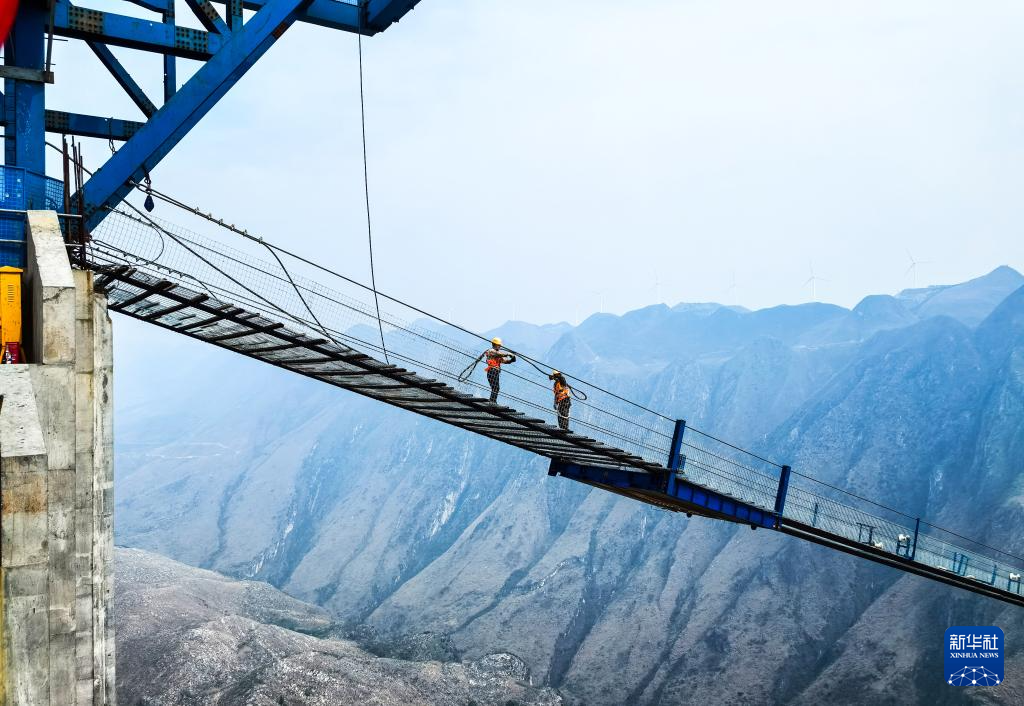 2024年3月27日,工人在贵州花江峡谷大桥上加固施工猫道。