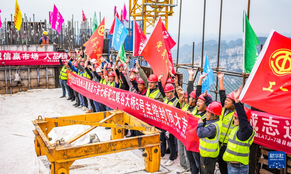 2023年10月24日,建设者在贵州花江峡谷大桥5号主塔上庆祝封顶。