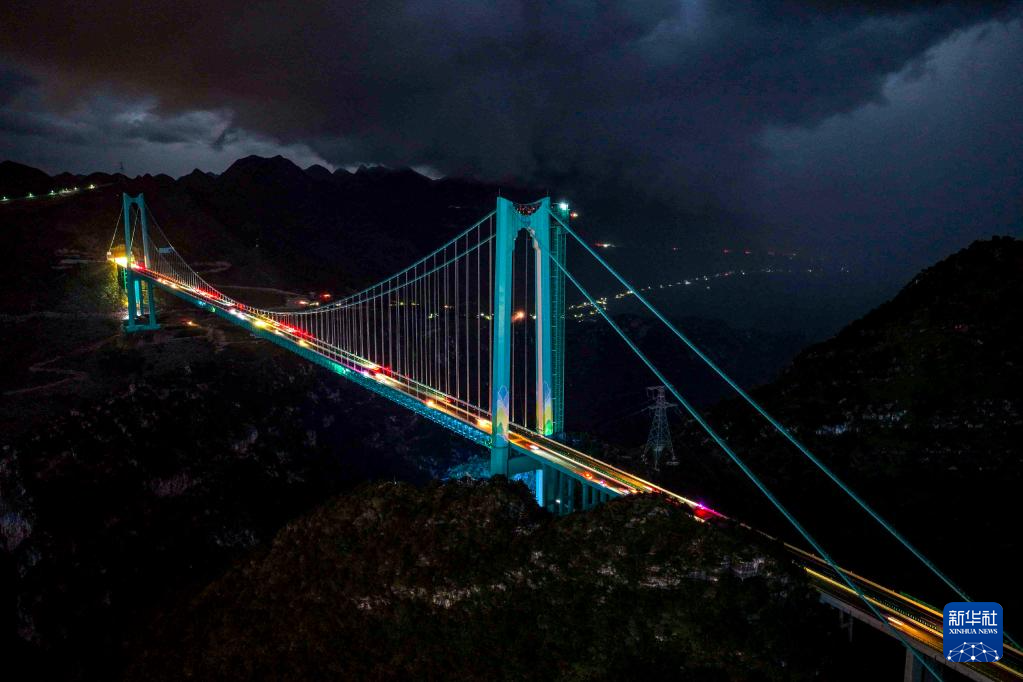 9月27日拍摄的夜幕下的贵州花江峡谷大桥(无人机照片)。
