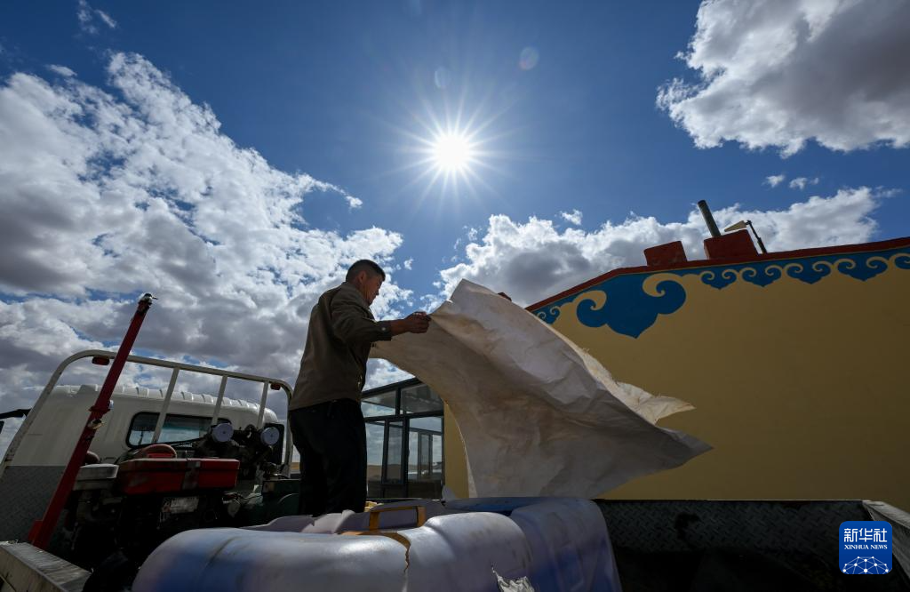 9月23日,钢宝力达在卫境嘎查家中的简易房内修补车胎。