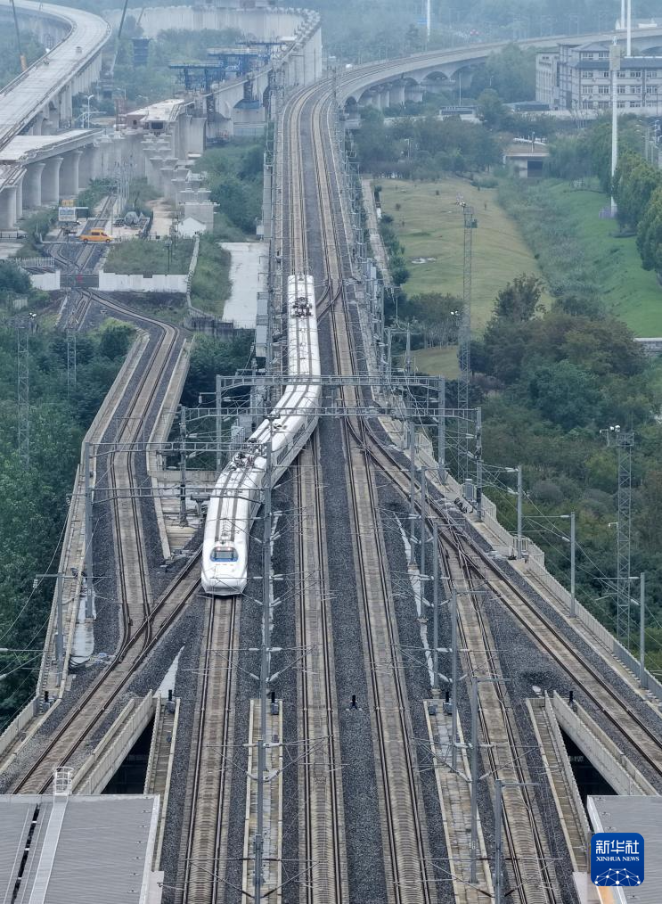 9月29日,一列动车组列车驶出扬州东站(无人机照片)。