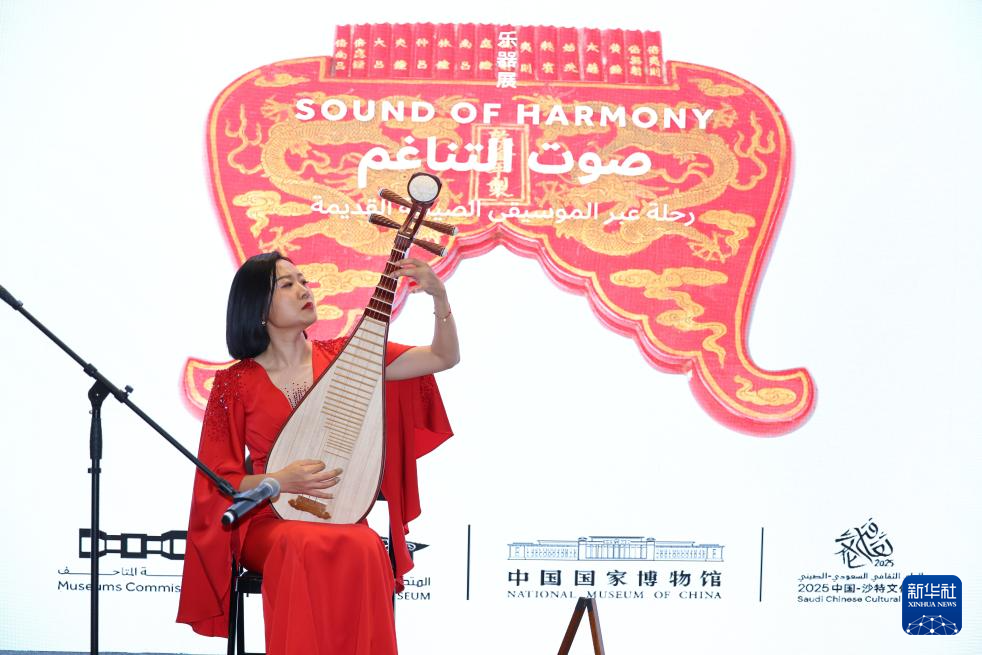 这是9月28日在沙特阿拉伯首都利雅得拍摄的“天地同和——中国古代乐器展”开幕式上的琵琶演奏表演。