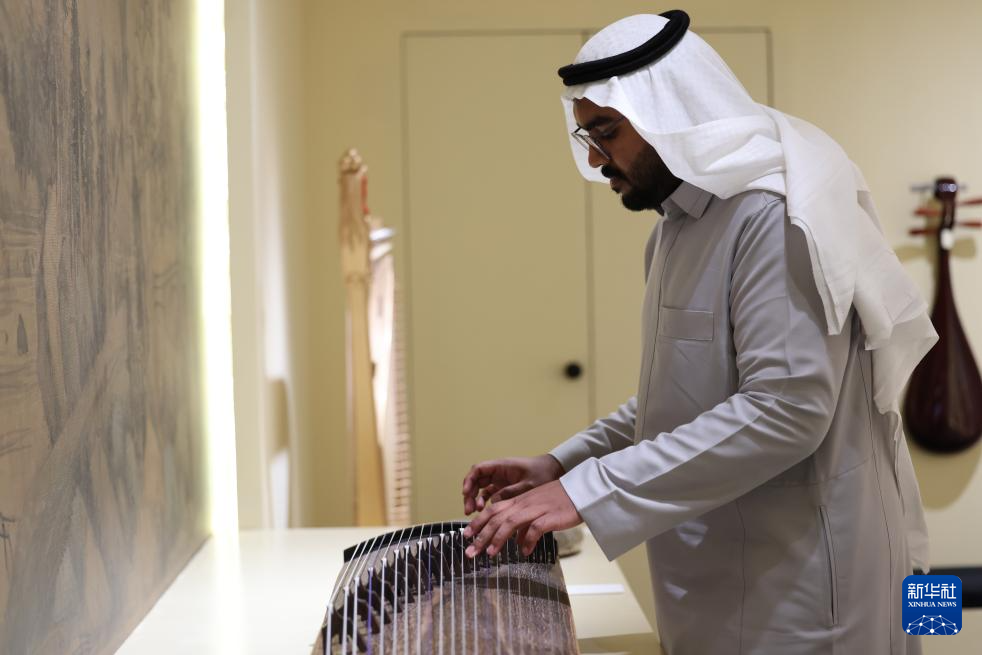 9月28日,在沙特阿拉伯首都利雅得,观众在“天地同和——中国古代乐器展”上体验古筝演奏。