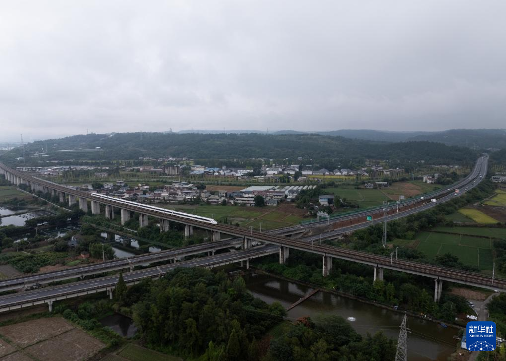 在九绵高速青莲互通附近,九绵高速与西成高铁交汇(9月27日摄,无人机照片)。