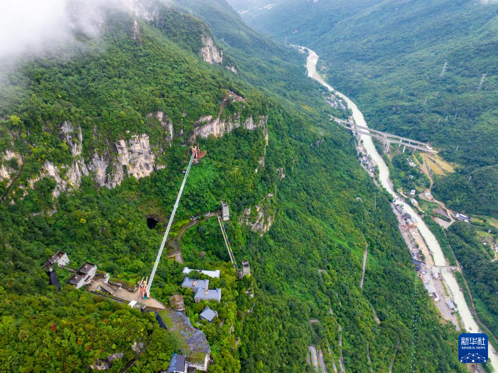 在北川县九皇山景区,高空玻璃桥、云中情人桥与九绵高速隧道连接桥同框(9月25日摄,无人机照片)。