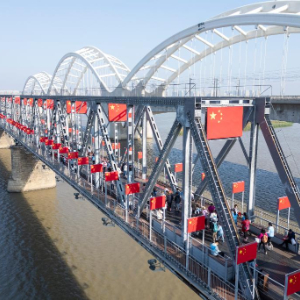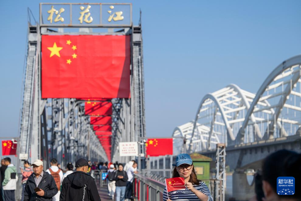 10月1日,游客在哈尔滨市滨州铁路桥上游览。