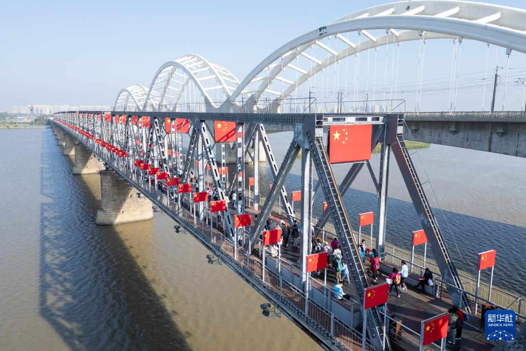 10月1日,游客在哈尔滨市滨州铁路桥上游览(无人机照片)。