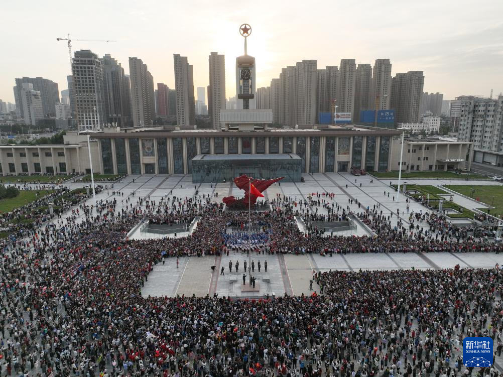 10月1日,人们在河北省石家庄解放广场参加升旗仪式(无人机照片)。