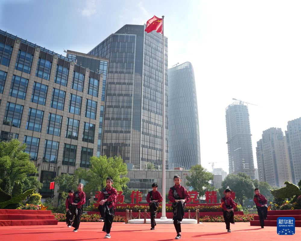 10月1日,在上海中共一大纪念馆前举行的文艺演出中,小朋友在表演舞蹈《男儿当自强》。