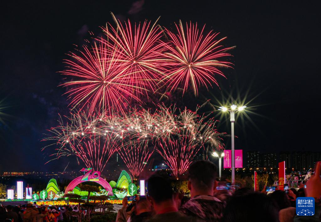 10月1日,新疆乌鲁木齐文化广场举行国庆节烟花表演。