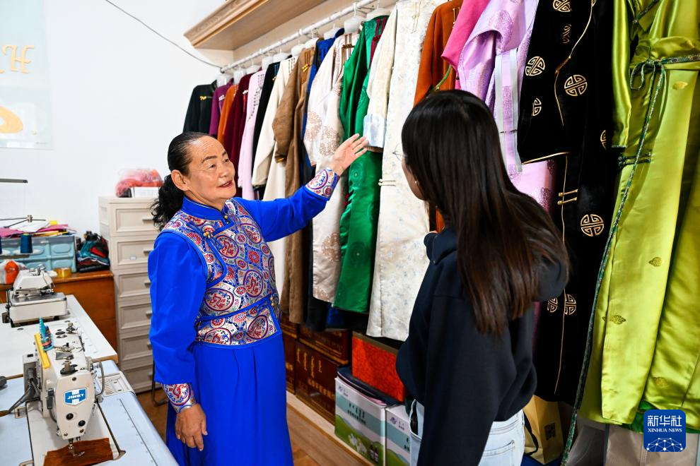 9月26日,通嘎拉嘎展示她制作的蒙古袍。