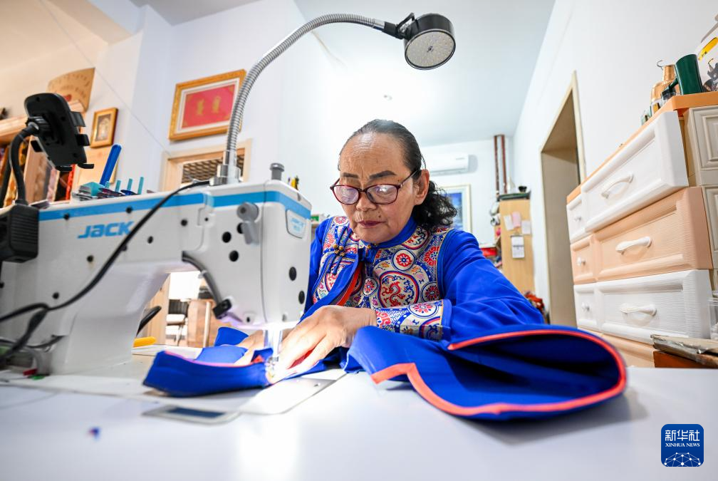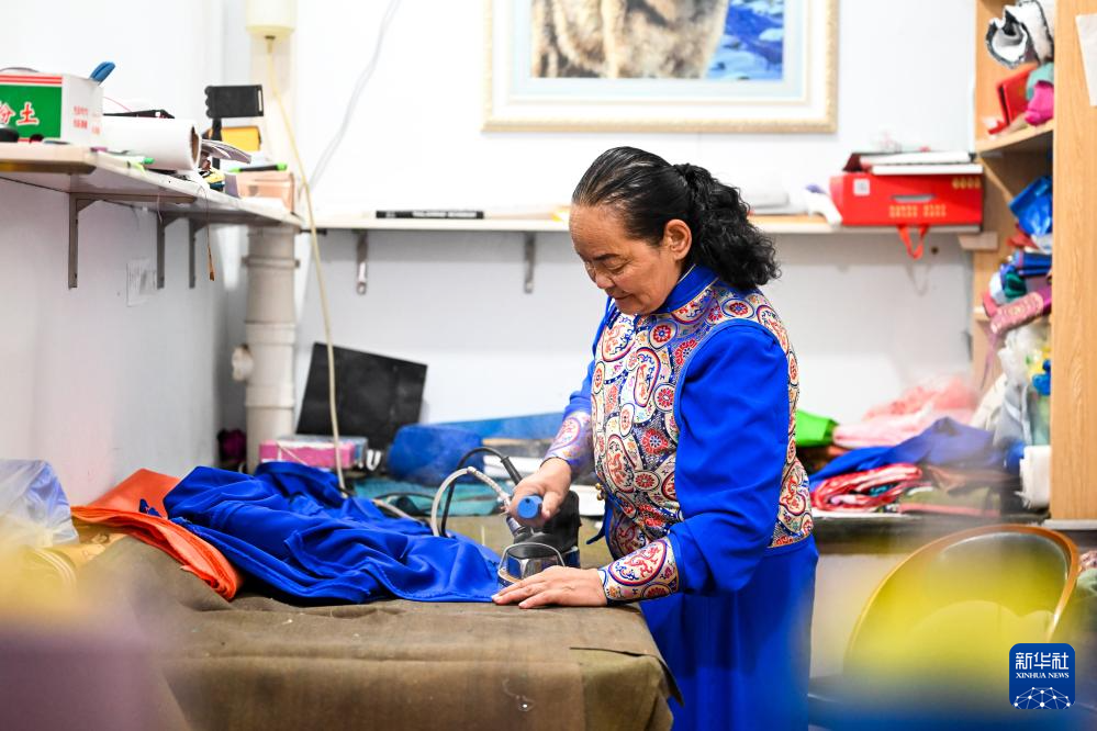 9月26日,通嘎拉嘎在店内缝制蒙古袍。
