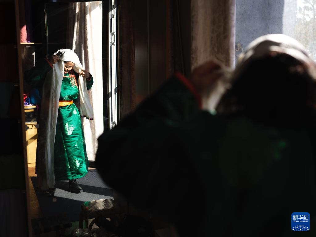 9月26日,在服装店里,通嘎拉嘎穿上自己制作的蒙古袍,准备去参加苏尼特左旗的民族团结进步表彰大会。