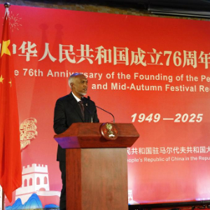 9月30日,在马尔代夫马累,马总统穆伊兹在中国驻马尔代夫大使馆举办的庆祝中华人民共和国成立76周年暨中秋招待会上致辞。