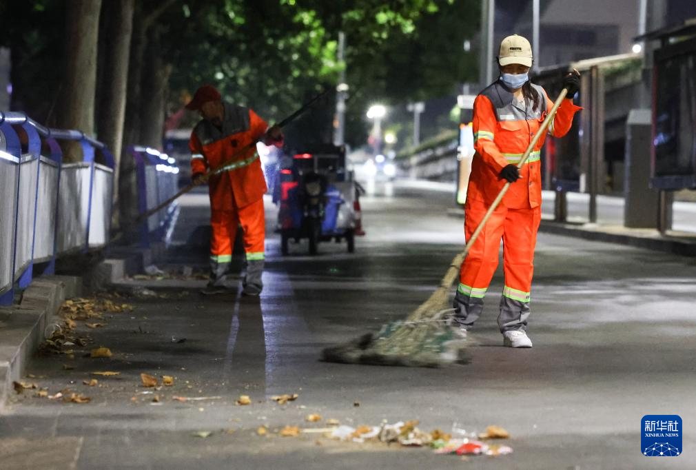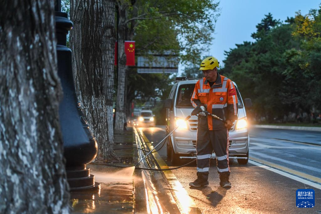 10月1日,河北省石家庄市新华区环卫工人在中华大街进行道路晨扫工作。