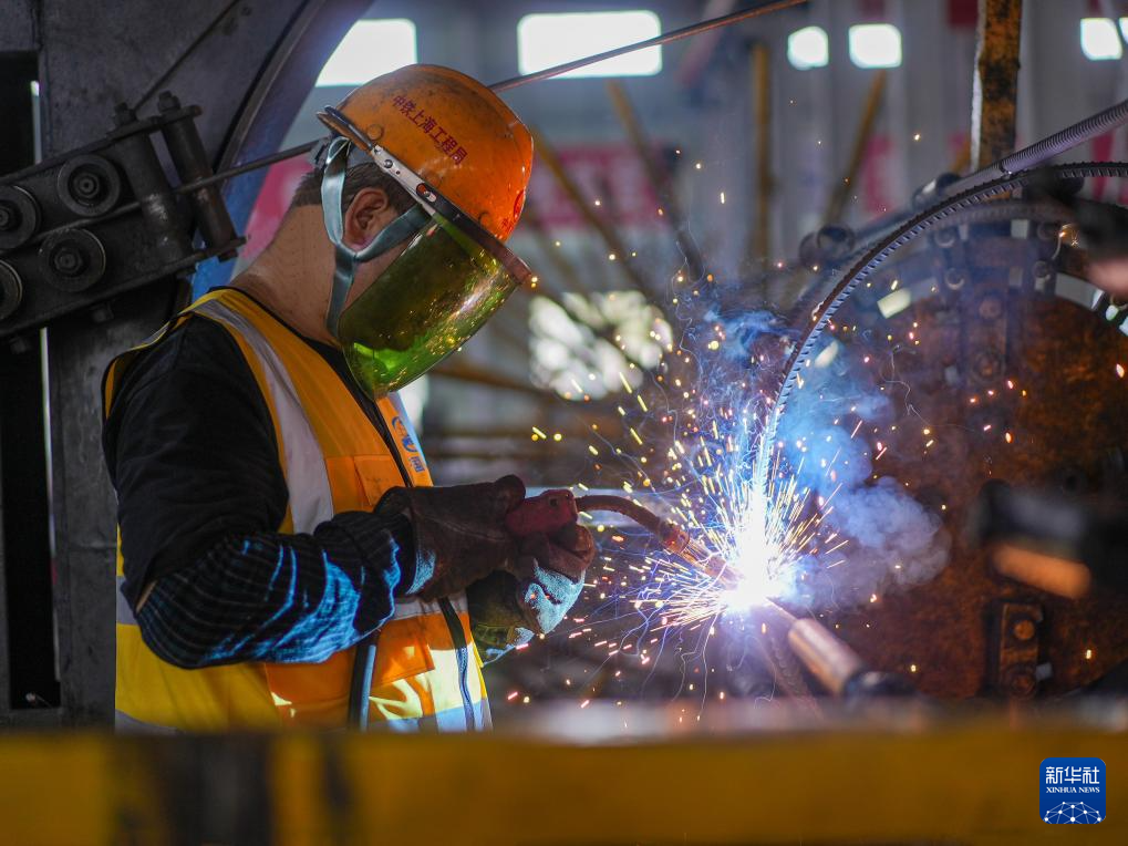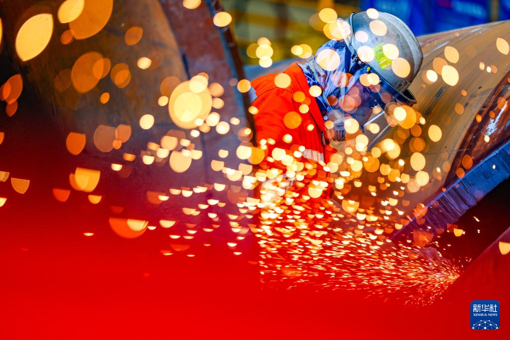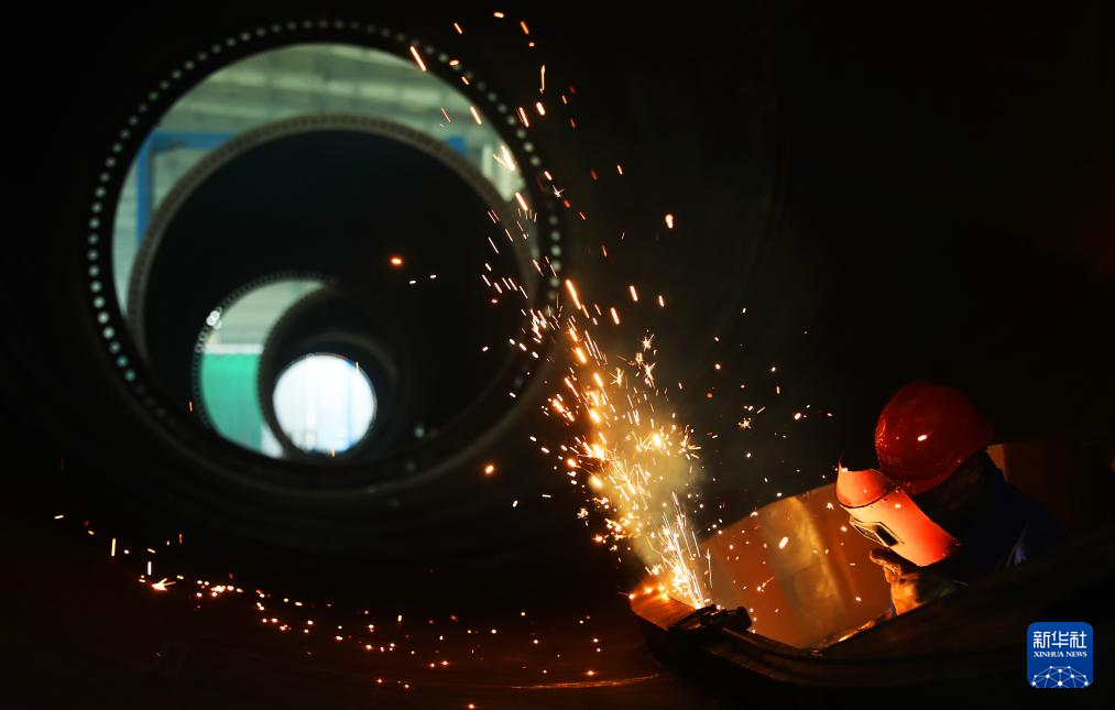 10月1日,在湖南省衡阳市衡山县经济开发区,恒岳重钢钢结构工程有限公司员工进行风电塔筒的部件加工作业。